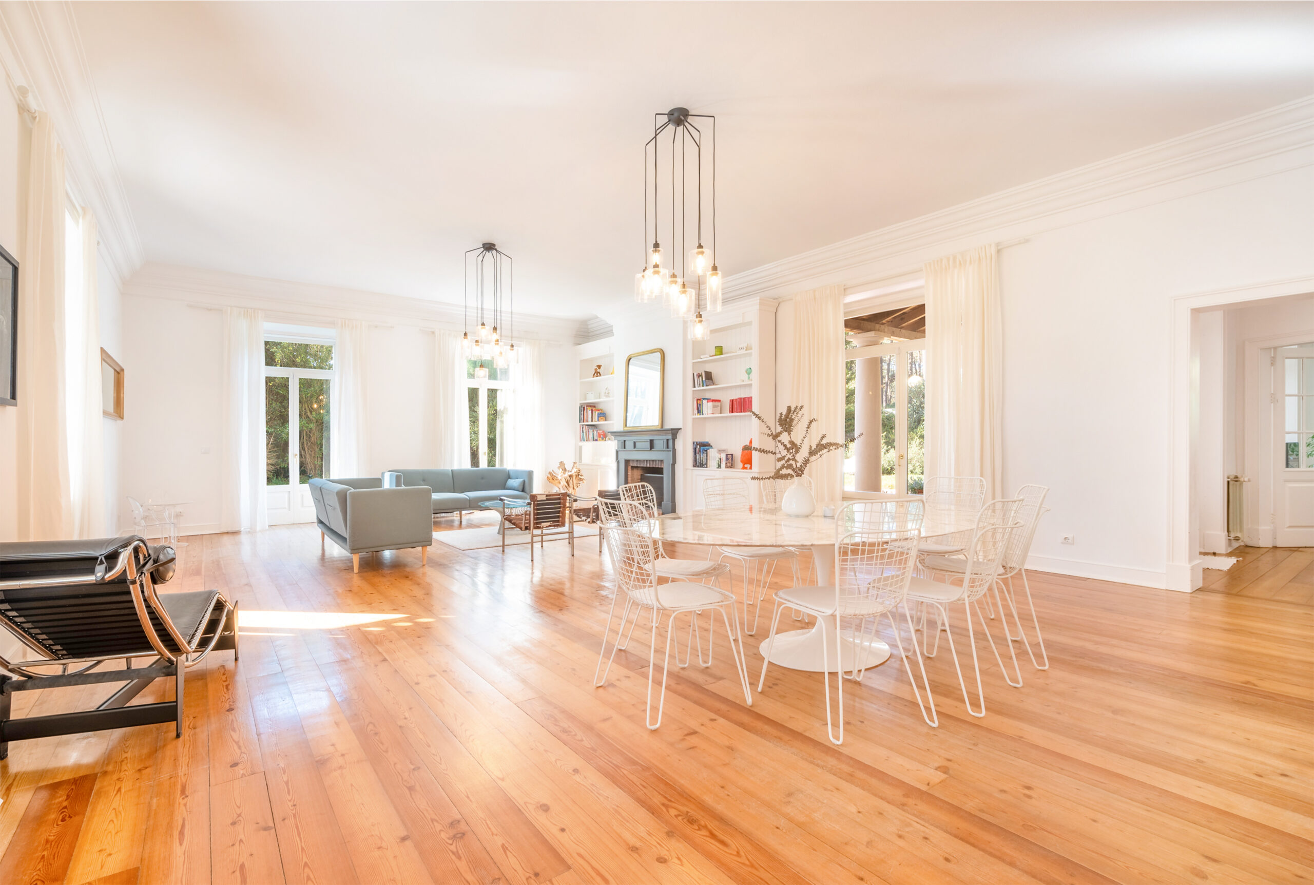 Double salon avec cheminée, plafond cathédrale et grandes baies vitrées apportant une luminosité exceptionnelle