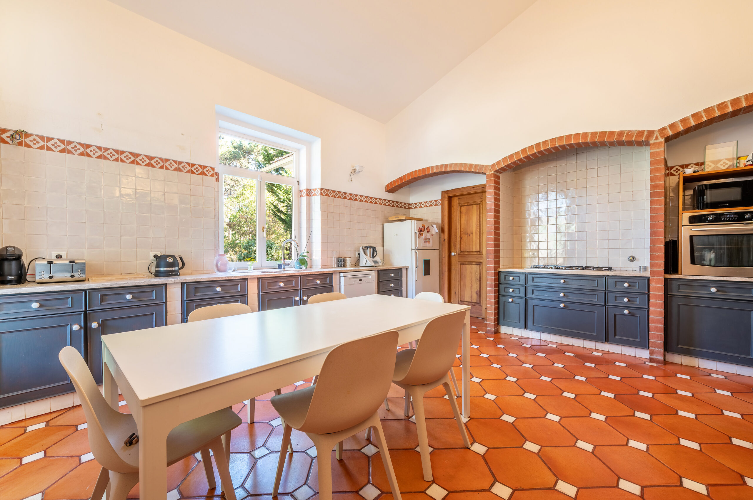 Cuisine entièrement équipée avec buanderie attenante et accès à une petite terrasse